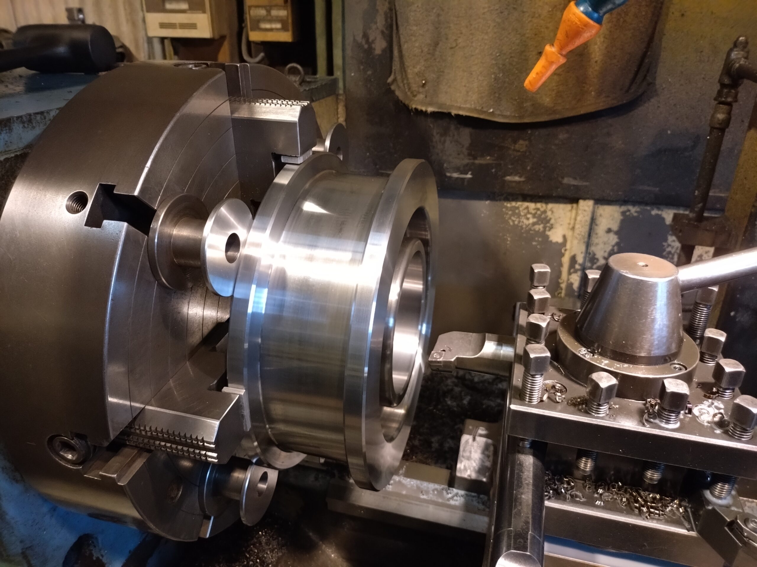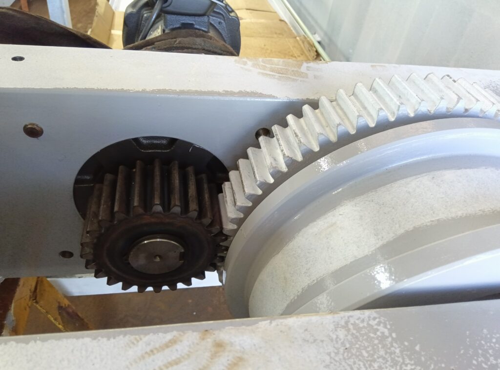 走行車輪はレールのサイズ、クレーンが走る速度に合わせて自社で製作しています。素材を旋盤で車輪や歯車へと削り出していきます。