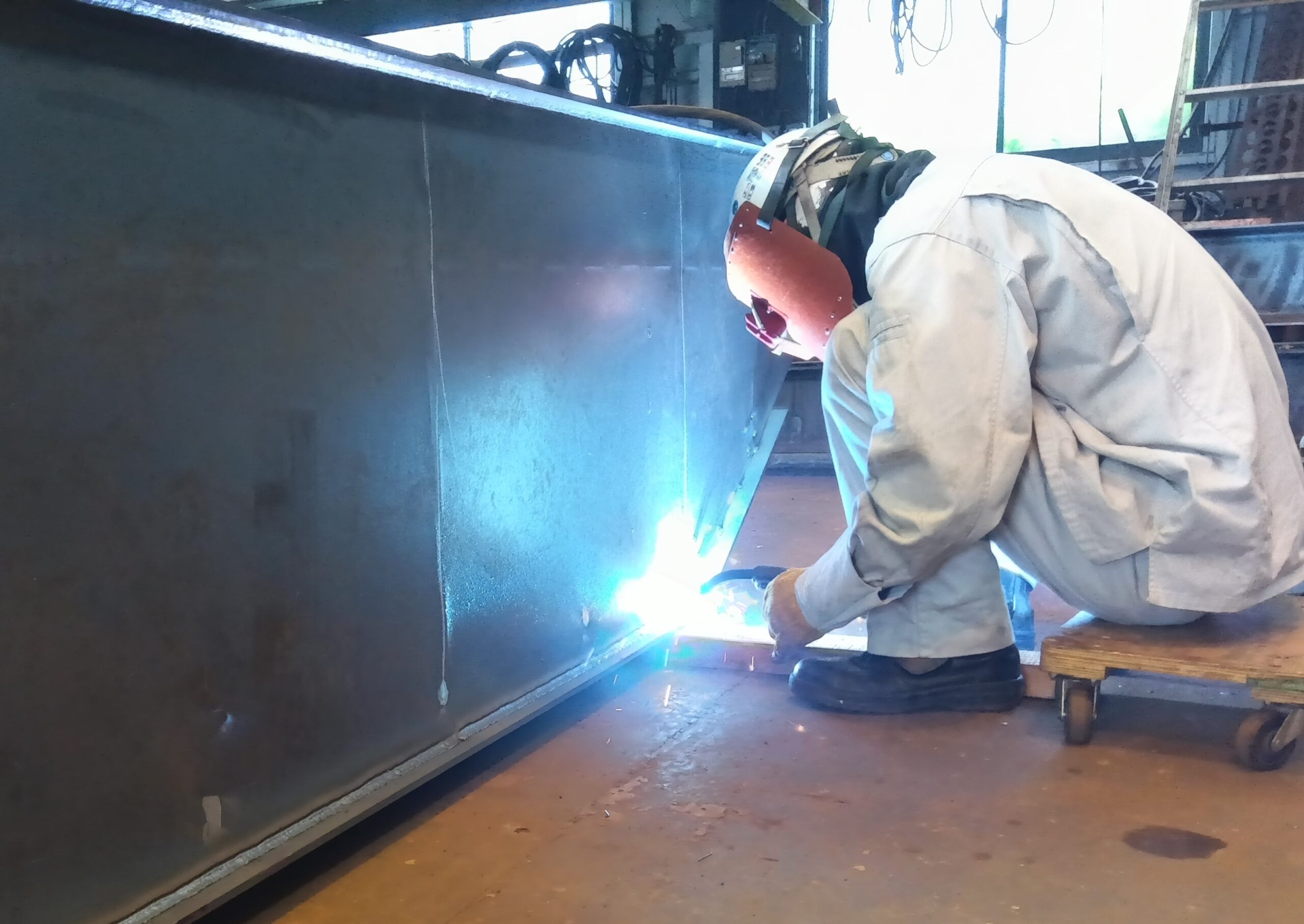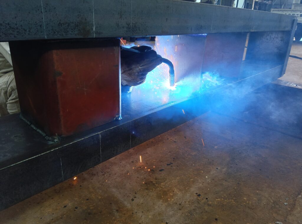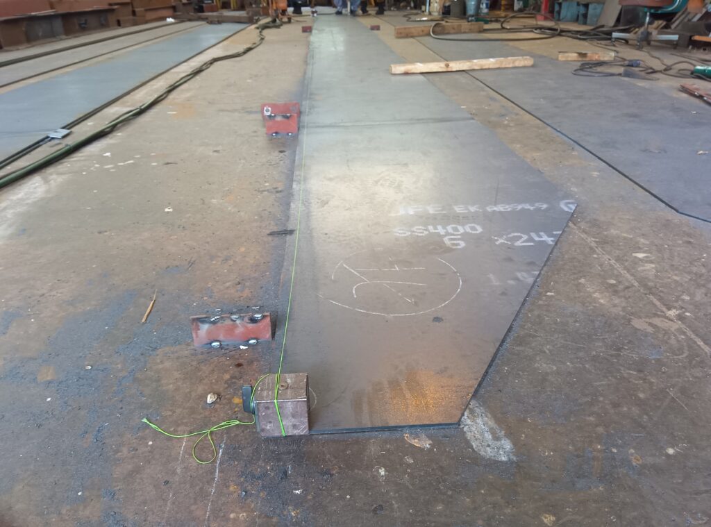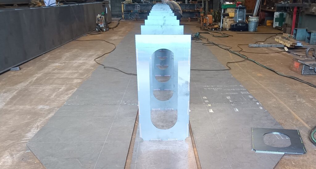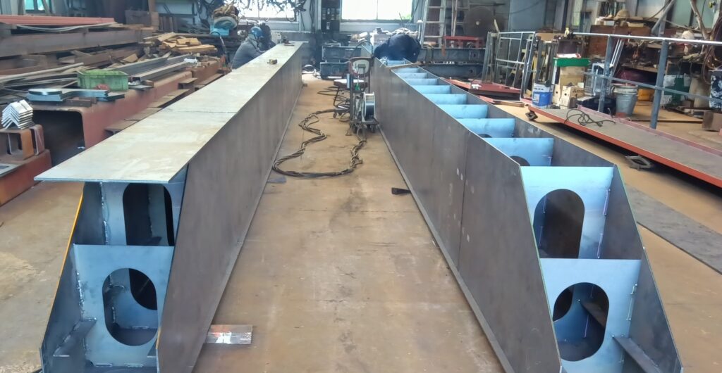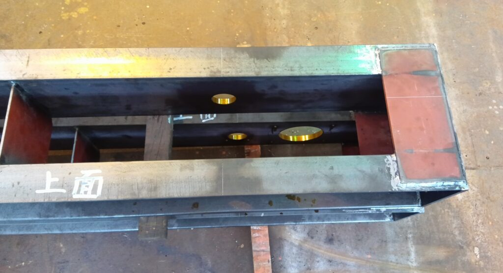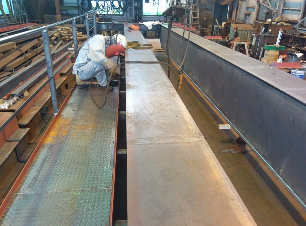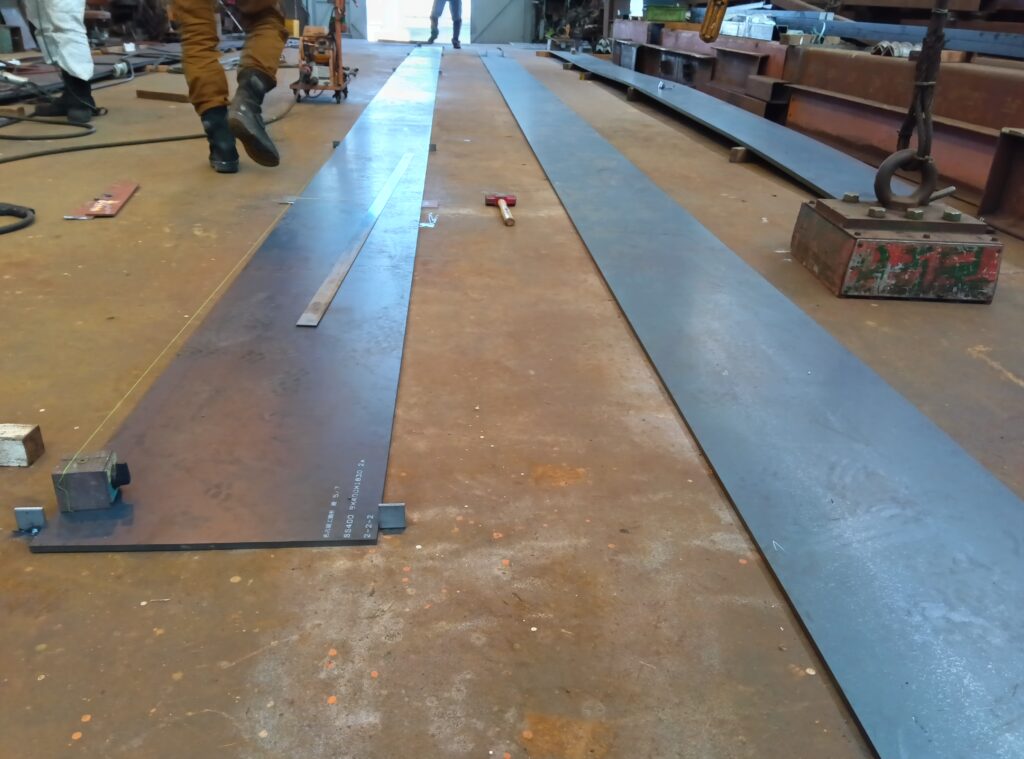 ボックス形ガーダーに使う板材は、母材から正確にキャンバーを付けてレーザー切りされたものを仕入れています。