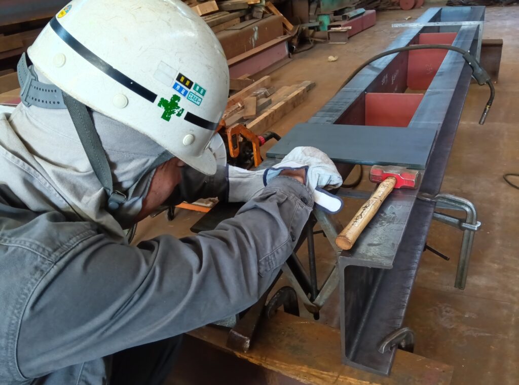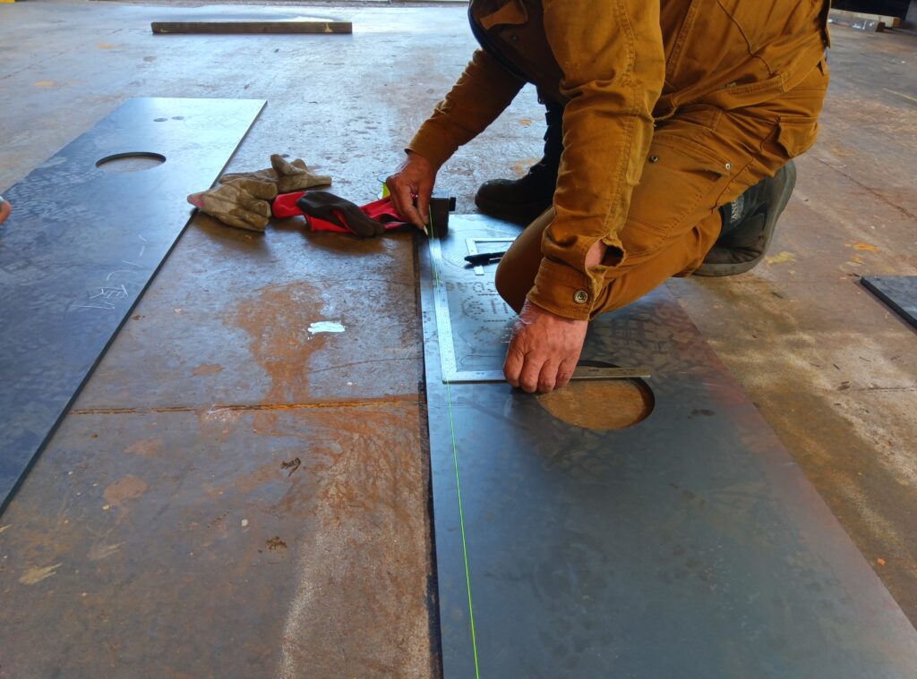 製作に使われる板材はレーザー切りもしくはシャーリング切断したものを、形鋼は切断機で寸法切りしたものを使い、形状と寸法に間違いがないように、製作図面と品物を何度も照らし合わせながら正確に形にしていきます。