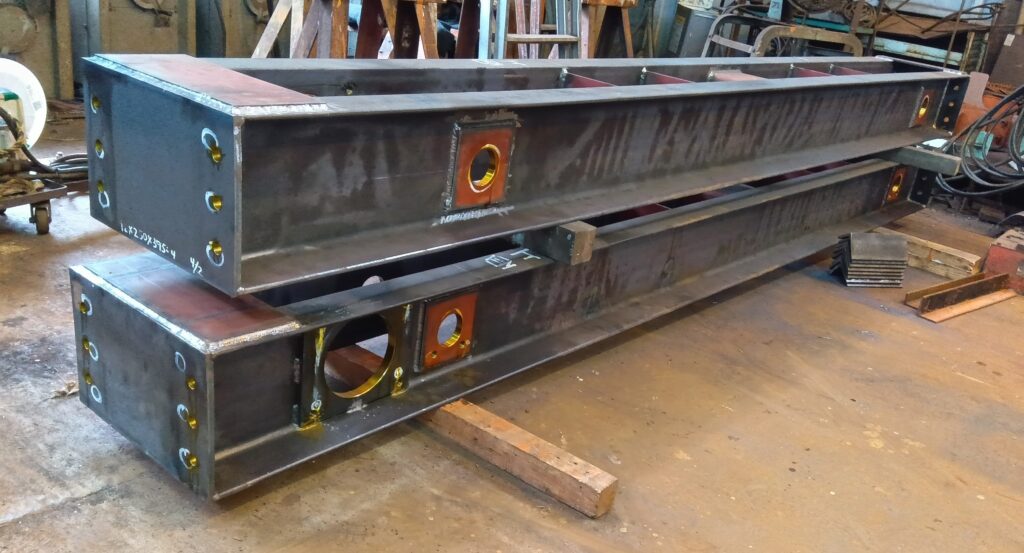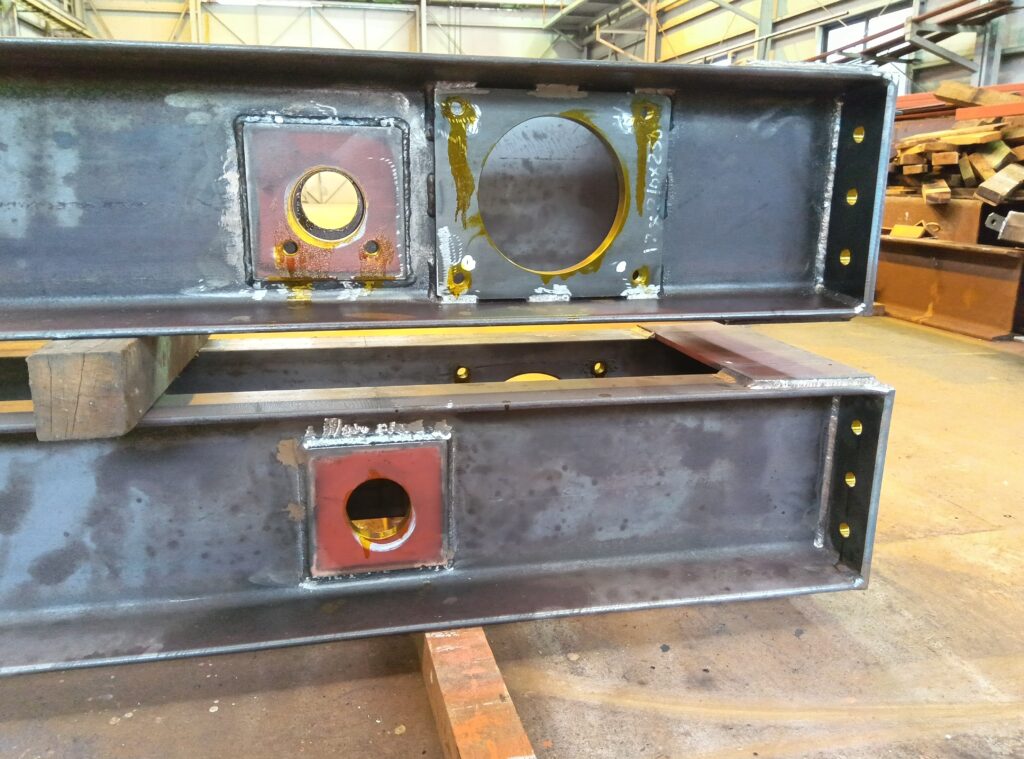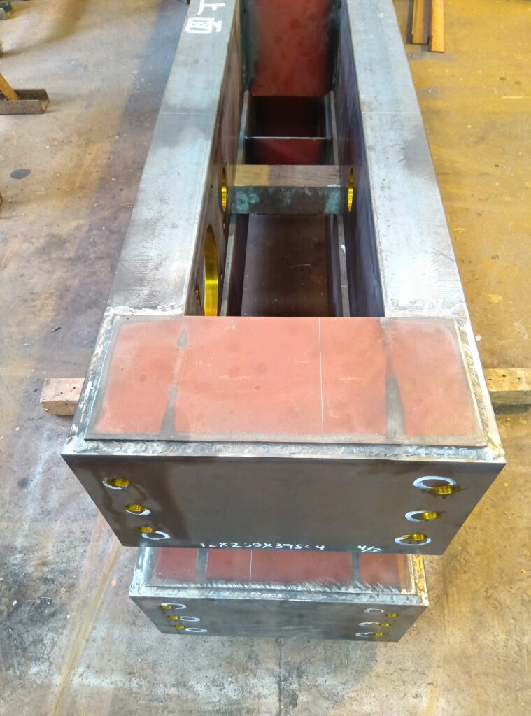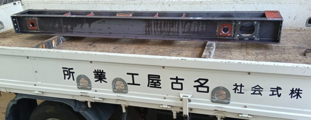 走行サドルの製作は溶接組立が完了したフレームに、車輪を組付けるための軸穴と、走行モーターを取付けるためのベース穴の穴開けを機械加工で行います。