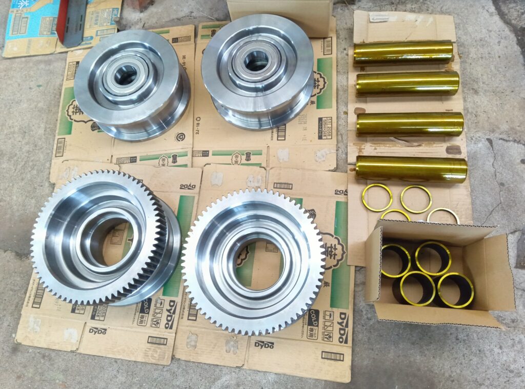 クレーン本体の仮組立が完了したら走行サドルに車輪を組付けていきます。