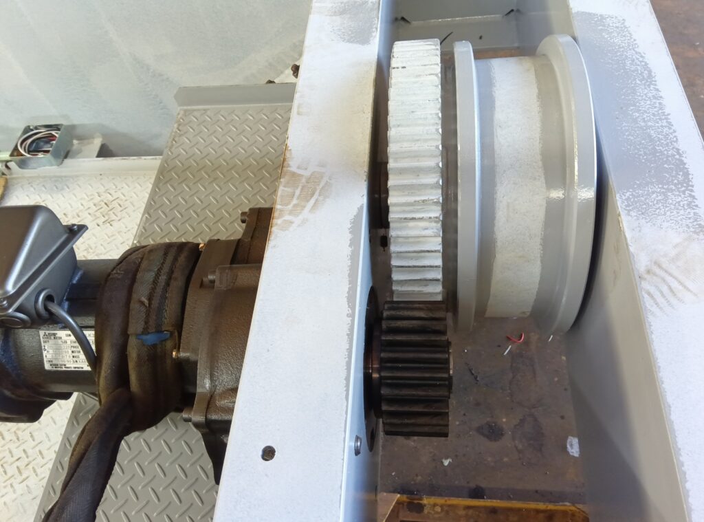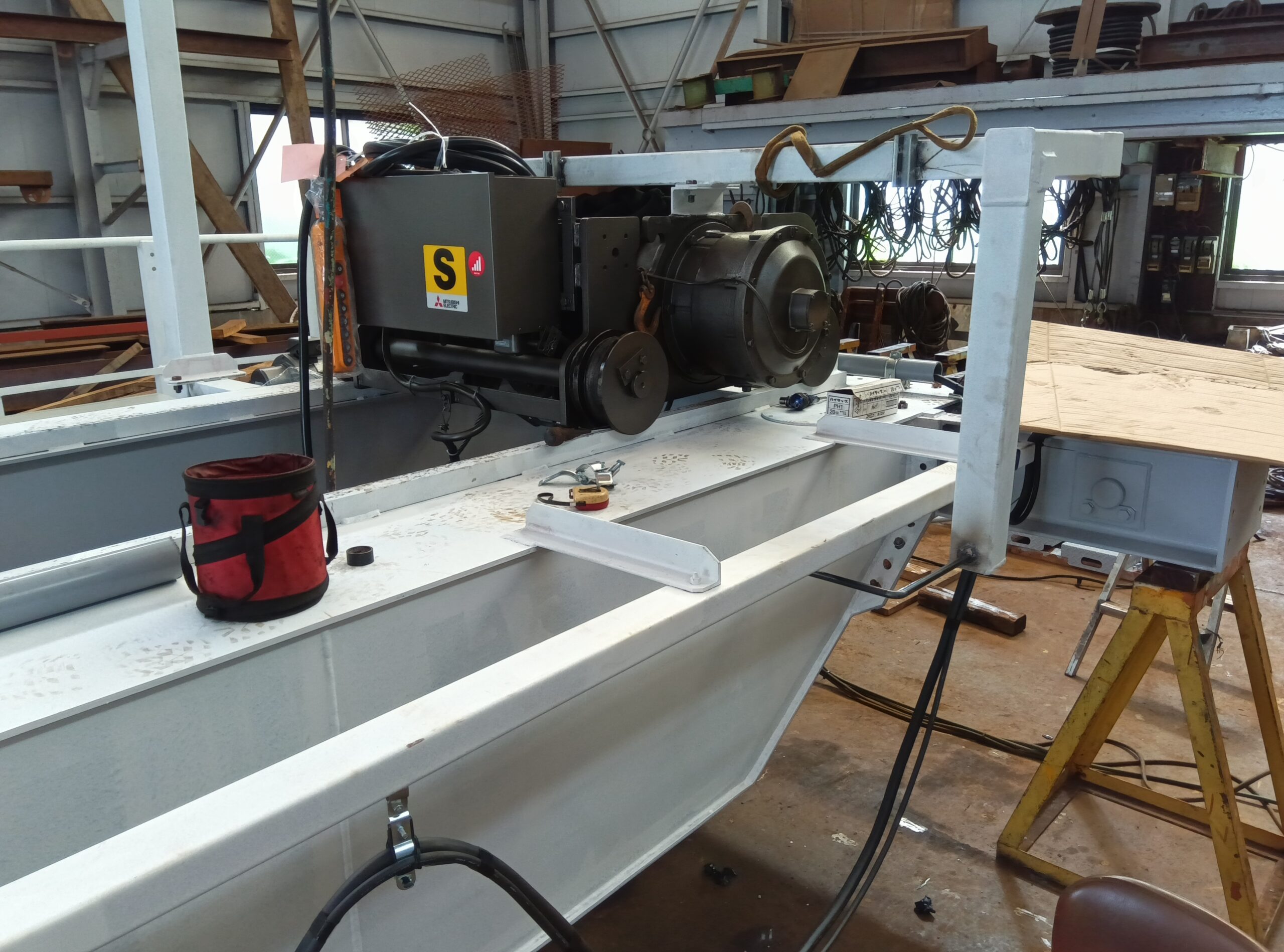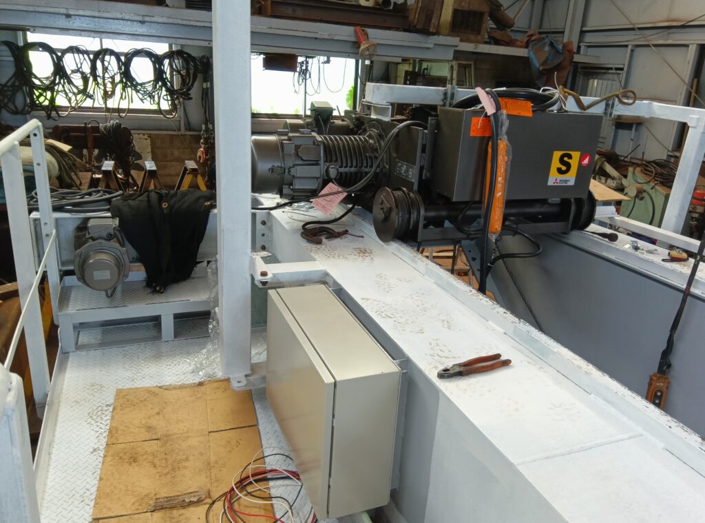 取付けた制御盤、仮に取り付けた走行モーター、ホイストに電気配線していきます。