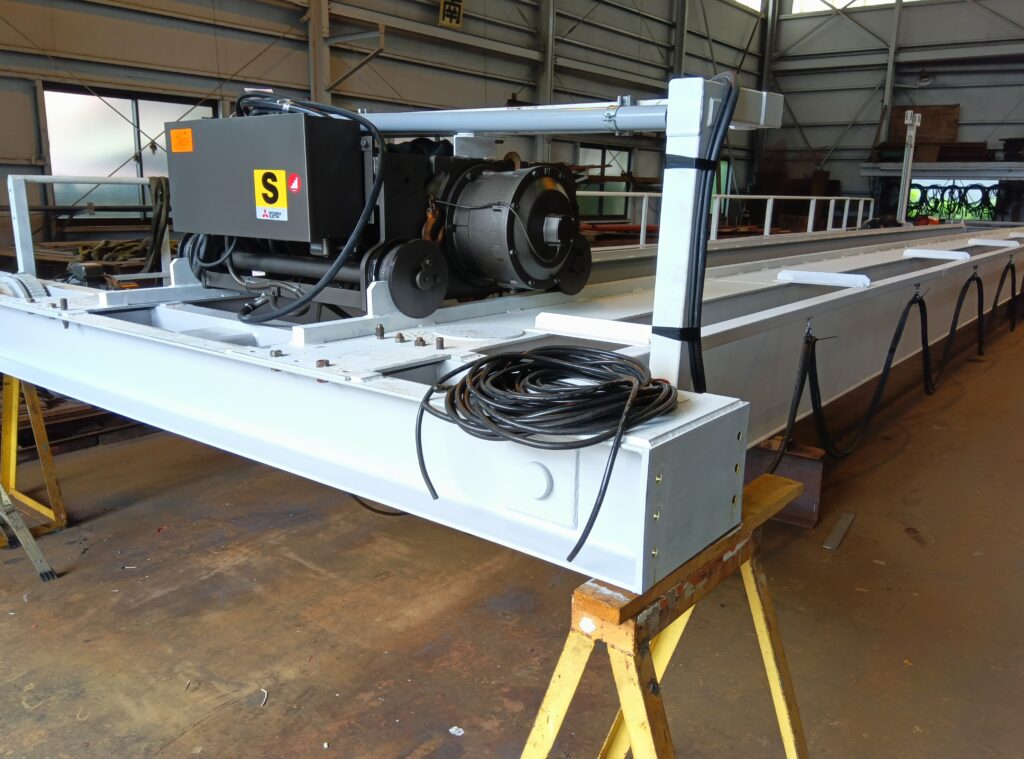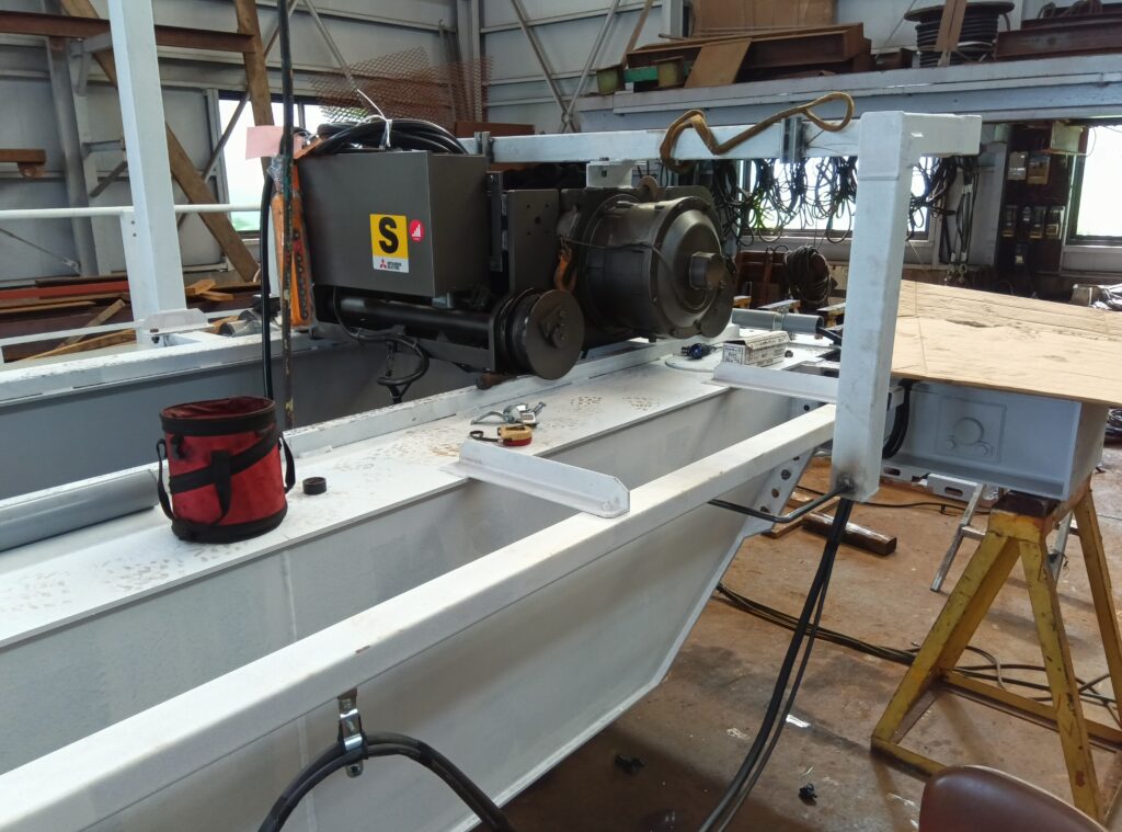 ホイストへの機内配線は両端の横行ストッパー一杯までホイストを移動させて、キャップタイヤの長さを決めるのと、給電金具が走行サドルに当たらないことを確認します。